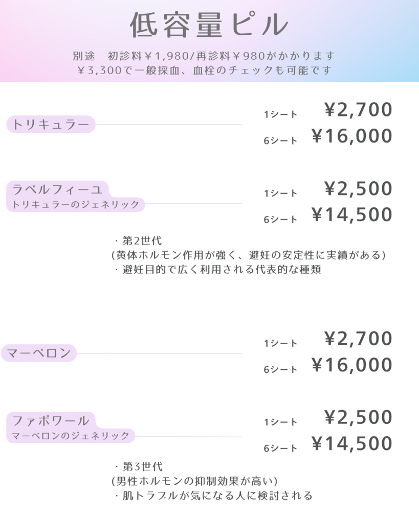 当院で扱う低用量ピルは第二世代のトリキュラー、ラベルフィーユ、第三世代のマーベロン、ファボワールです。