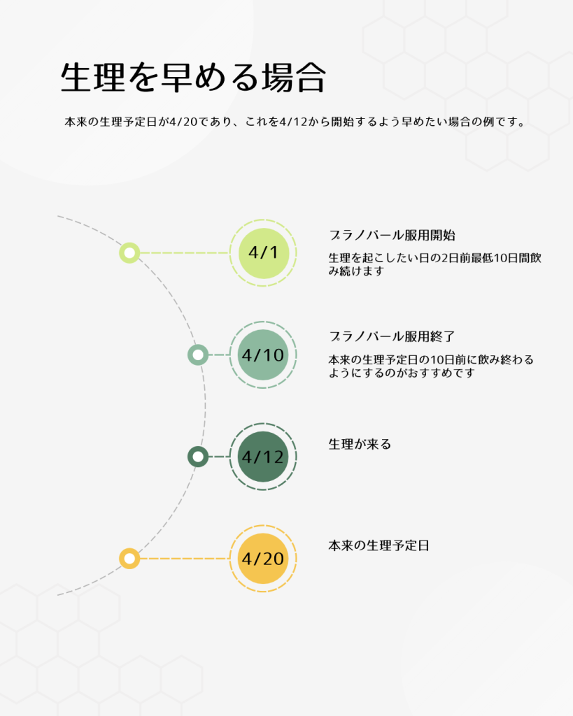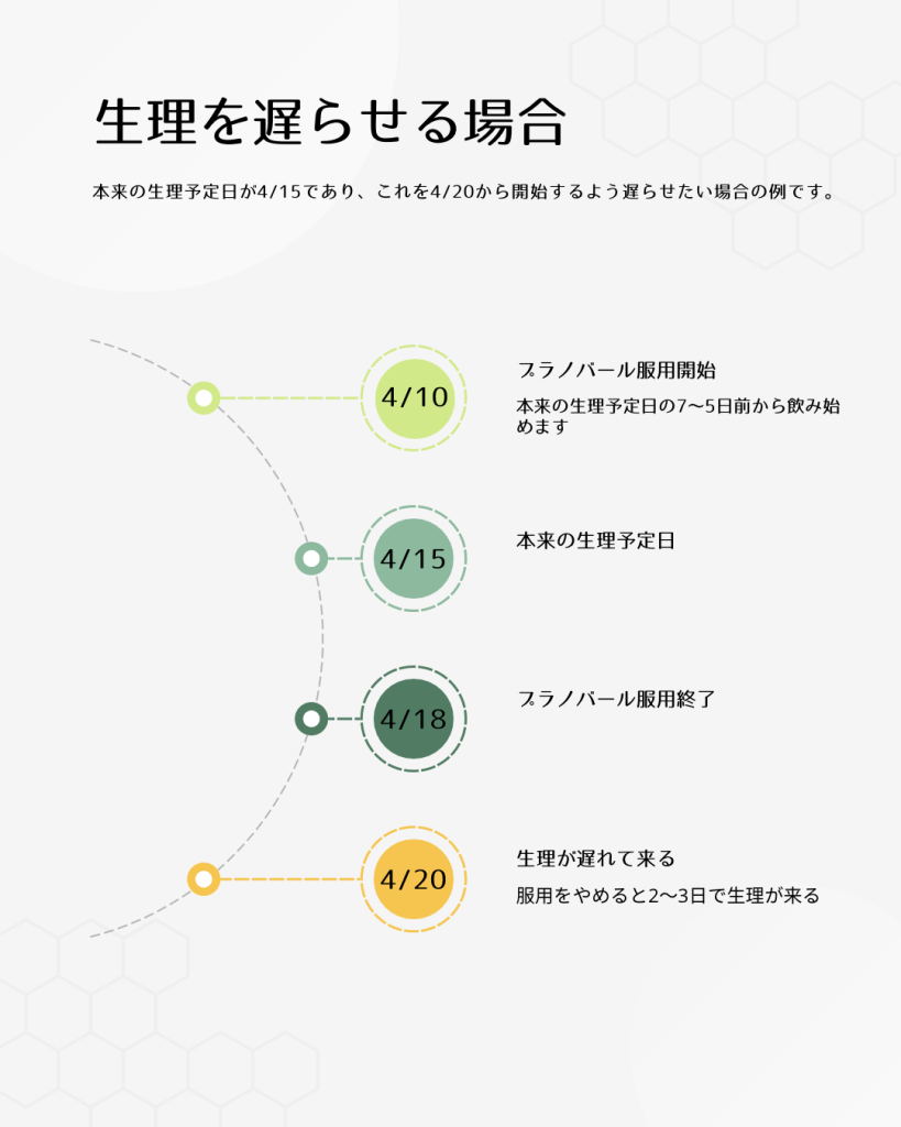 ずらしたい生理の前の生理が始まった時~5日目までにプラノバールを内服し、生理を起こしたい日の2日前まで最低10日間服用を続けます。